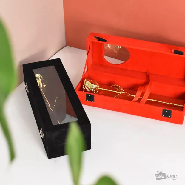 Élégante et raffinée, symbole de tout votre amour, finement recouverte d’or 24 carats, elle surprendra par sa grâce et sa beauté. Présentée dans son coffret habillé de velours rouge ou noir, cette fleur unique et précieuse d’un éclat doré et brillant sera visible par une petite vitre en forme de cœur, qui la conservera à l’abri. Cadeau exceptionnel, cette rose sera la témoin de votre attachement et de votre engagement… L’authenticité de cette rose dorée est garantie grâce à un certificat. Ce cadeau dans son joli coffret avec couleur au choix lui plaira à coup-sûr, et changera du traditionnel bijou.