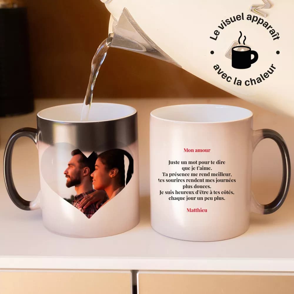 Faites fondre les cœurs avec ce mug noir thermoréactif qui dévoile un message personnalisé et une photo lorsque vous y versez une boisson chaude.