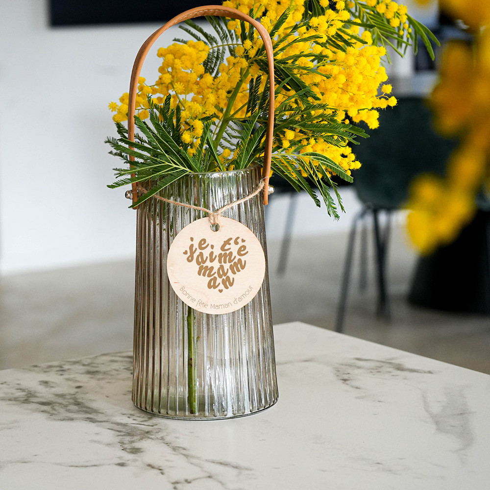 Le bouquet de fleurs reste un indémodable, mais cette année, on l’offre avec un vase côtelé au médaillon en bois personnalisable. Ce qui le rend hyper tendance, c’est ce mélange de matières : le verre travaillé et la chaleur du bois gravé. Le petit médaillon « Je t’aime Maman » apporte cette dimension sentimentale qui transforme un objet utilitaire en un trésor qu’elle gardera toute sa vie sur son buffet. C’est chic, épuré, et terriblement touchant.